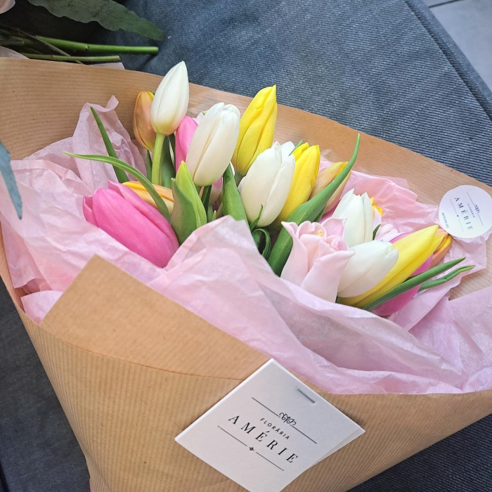 Buchet compus din 17 lalele colorate, hartie de matase si ambalaj kraft.