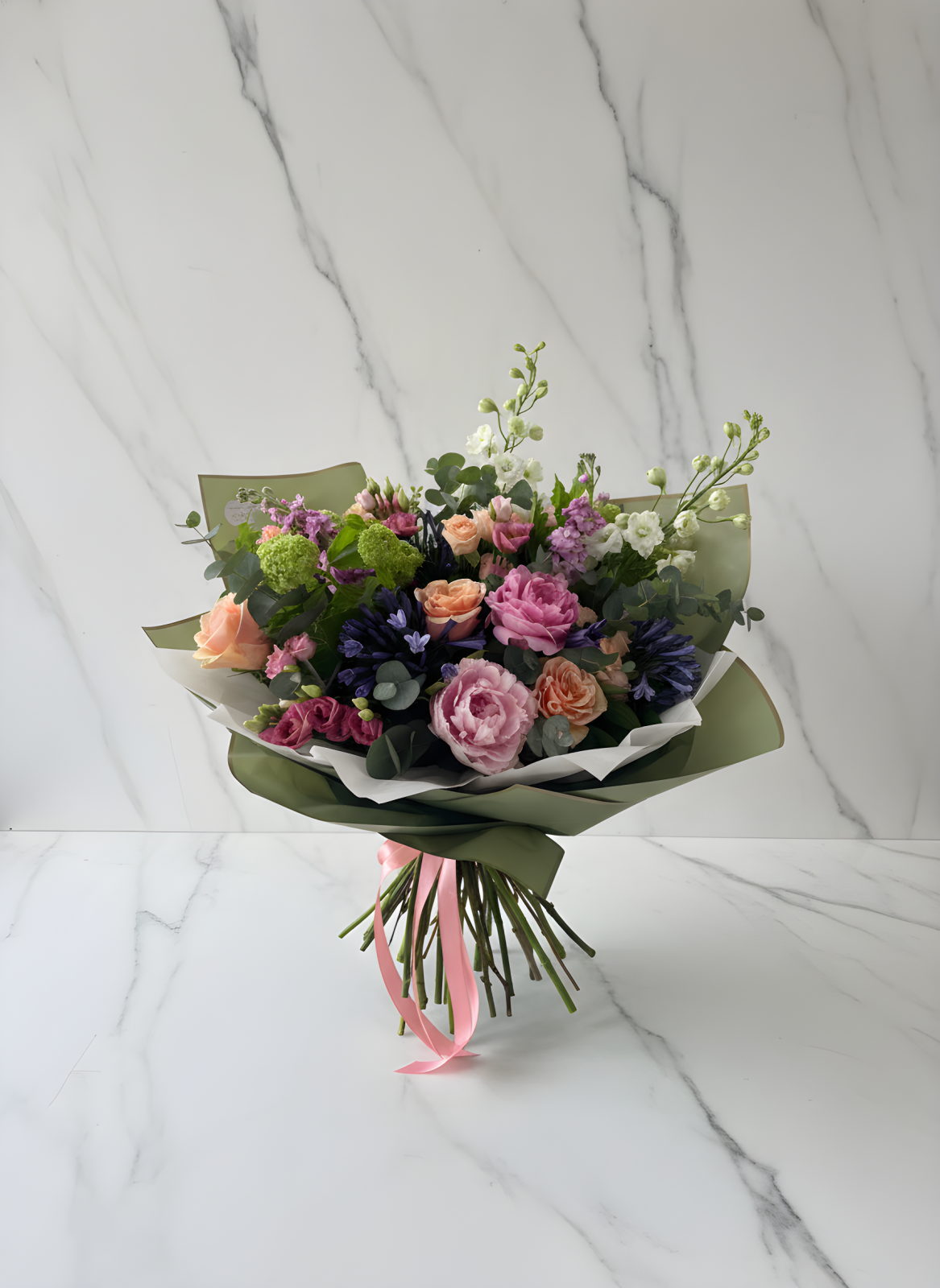 Buchet de dimensiune mare, compus din bujori, trandafiri, agapanthus, viburnum, eustoma, delphinium, mathiola, eucalipt si ambalaj colorat.